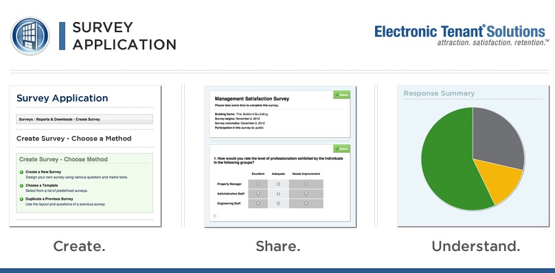 The Electronic Tenant® Solutions Survey Application is a diverse inquiry, information collection and analytical tool. The Survey App allows for the rapid and inexpensive deployment of surveys and questionnaires with multiple query and response options (i.e. rate, rank, satisfaction, agreement, score, etc.). Beyond understanding individual and group propensities, the agile infrastructure of the app provides for astute data collection, aggregation and analysis capabilities. Examples of such capacity include Punch List, Inspection, RFP / RFI and performance measurement and recordation. Information collection excels in a desktop, web browser, tablet and smartphone environment.